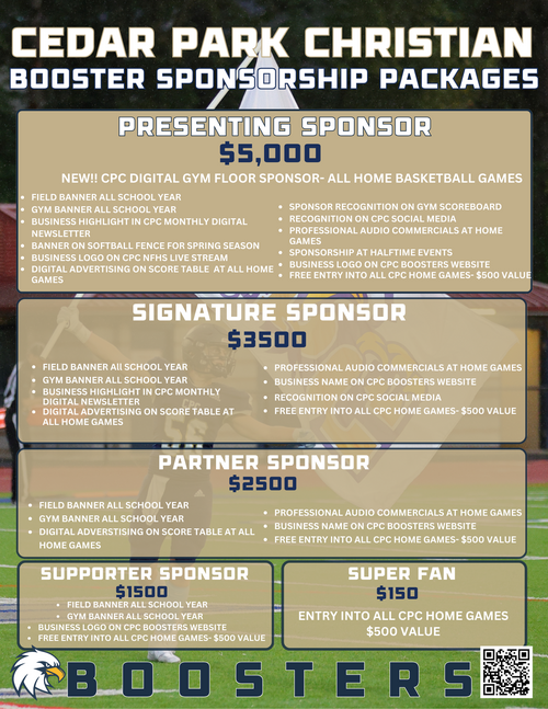 Cedar Park Christian Athletics Booster Club is a 501(c)3 IRS designated Public Charity organization; 45-2411973. Each sponsorship opportunity is considered a charitable contribution.
